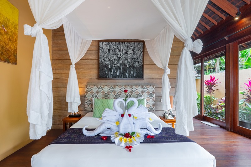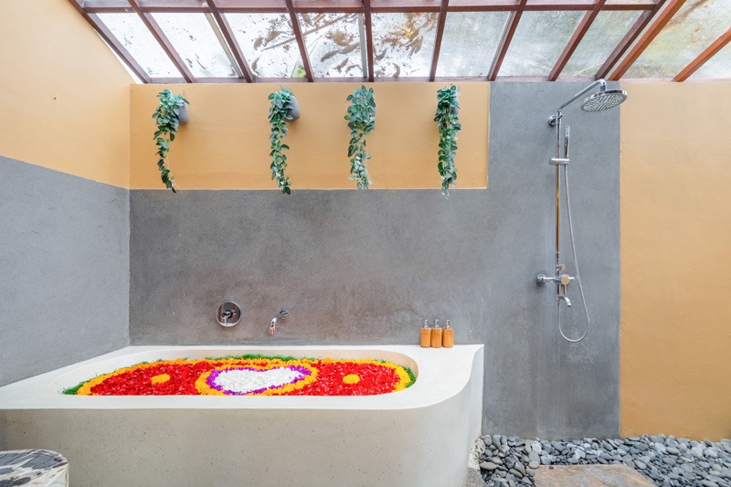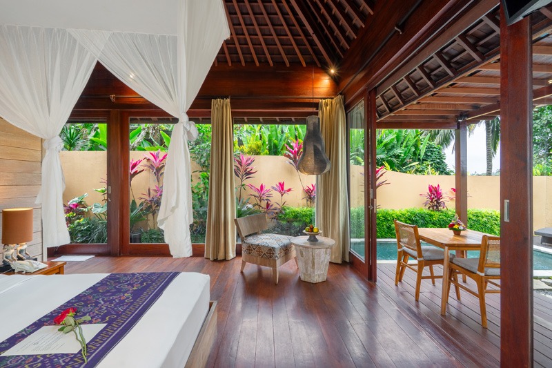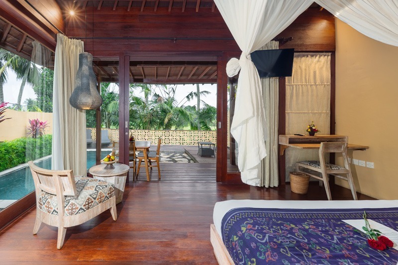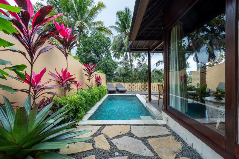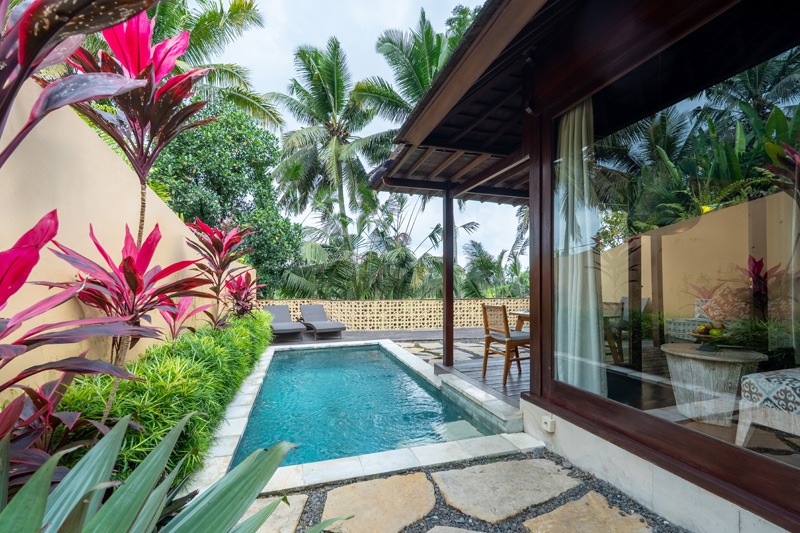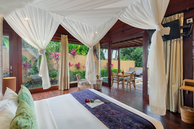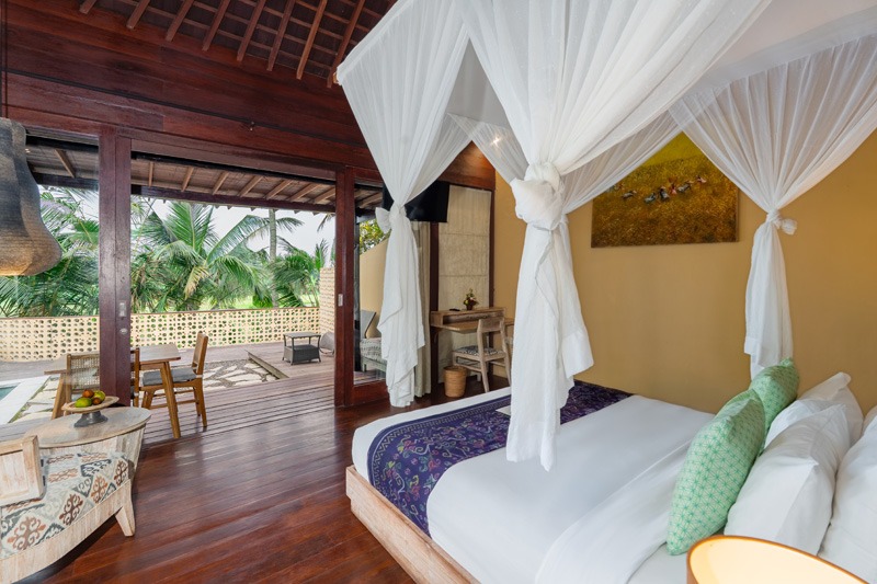 Facing to the east, with lush green view of rice field, this villa offers a lot of space in the bedroom. With terrace and day bed, you can enjoy your breakfast and afternoon tea while watching the sun rise or dipping in your private pool villa. All villa is walled around so you have your privacy while enjoying your private time at Villa. All villa is equipped with modern sanitary, amenities, water kettle, small fridge, bath tub, hot and cold shower.